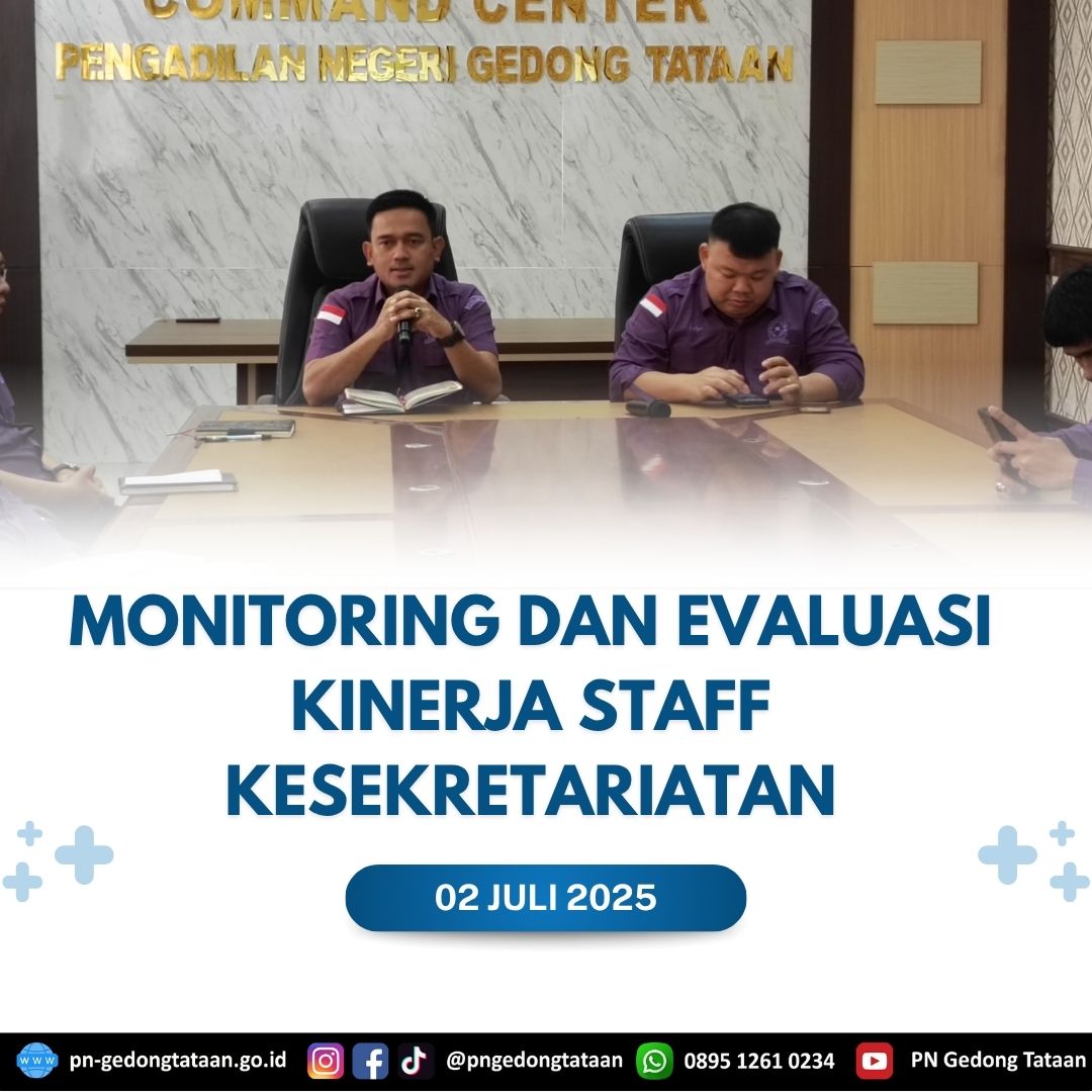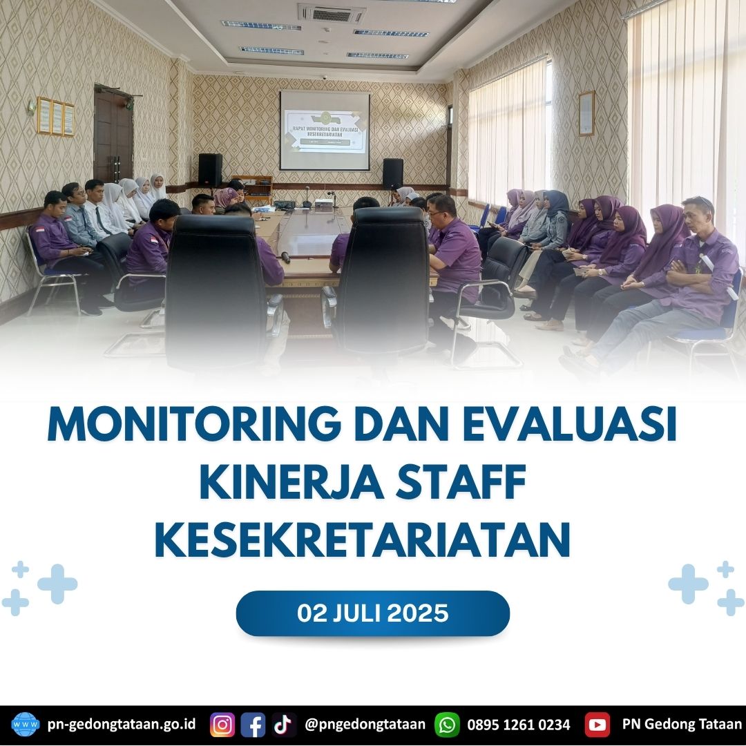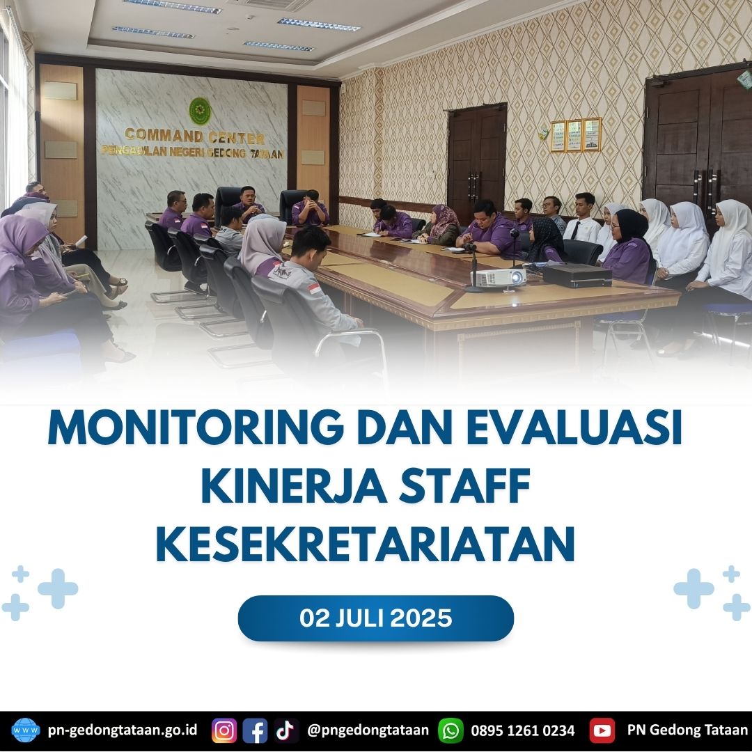 Bertempat di Ruang Command Center Pengadilan Negeri Gedong Tataan telah dilaksanakannya Rapat Monitoring dan Evaluasi Kinerja Kesekretariatan yang dipimpin langsung oleh Ketua Pengadilan Negeri Gedong Tataan Bapak Nugraha Medica Prakasa, S.H., M.H., dan dihadiri oleh Wakil Ketua Pengadilan Negeri Gedong Tataan Bapak Dr.Edy Siong, S.H.,M.H, turut hadir Sekretaris Pengadilan Negeri Gedong Tataan Bapak Arya Dharma Syahrie, S.H.,M.H, Para Kasubbag, Jabatan Fungsional, Para Staf, Para CPNS dan PPNPN PN Gedong Tataan serta Honorer Pemda yang diperbantukan pada Pengadilan Negeri Gedong Tataan.