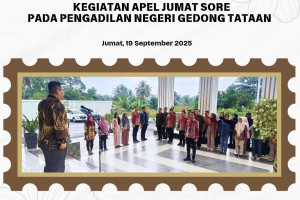Jum'at, 19 September 2025. Dilaksanakannya kegiatan rutin apel Jumat sore, diikuti oleh seluruh Aparatur Pengadilan Negeri Gedong Tataan. Bertindak sebagai Pembina apel yaitu Hakim Pengadilan Negeri Gedong Tataan Bapak M. Rizqi Zamzami, S.H.,M.H dan Sdr. Rizky Widodo bertindak sebagai Pemimpin apel.