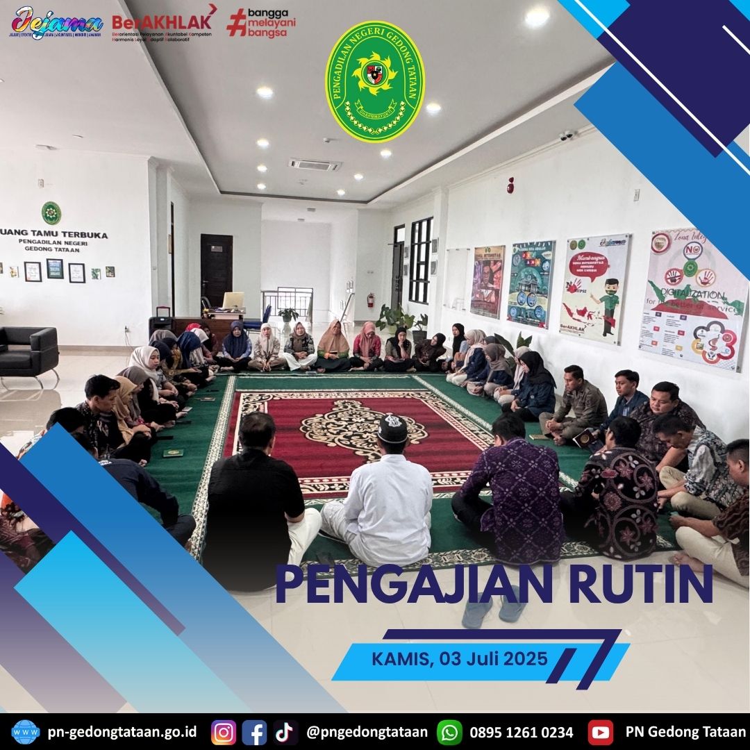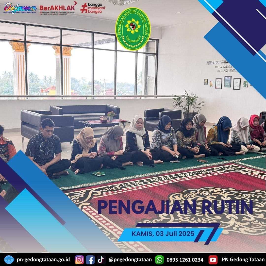 Kegiatan Pengajian Rutin bersama di lingkungan Pengadilan Negeri Gedong Tataan yang diikuti oleh seluruh warga Pengadilan Negeri Gedong Tataan yang beragama muslim yang diselenggarakan di Ruang Tamu Terbuka Lantai 2 Pengadilan Negeri Gedong Tataan