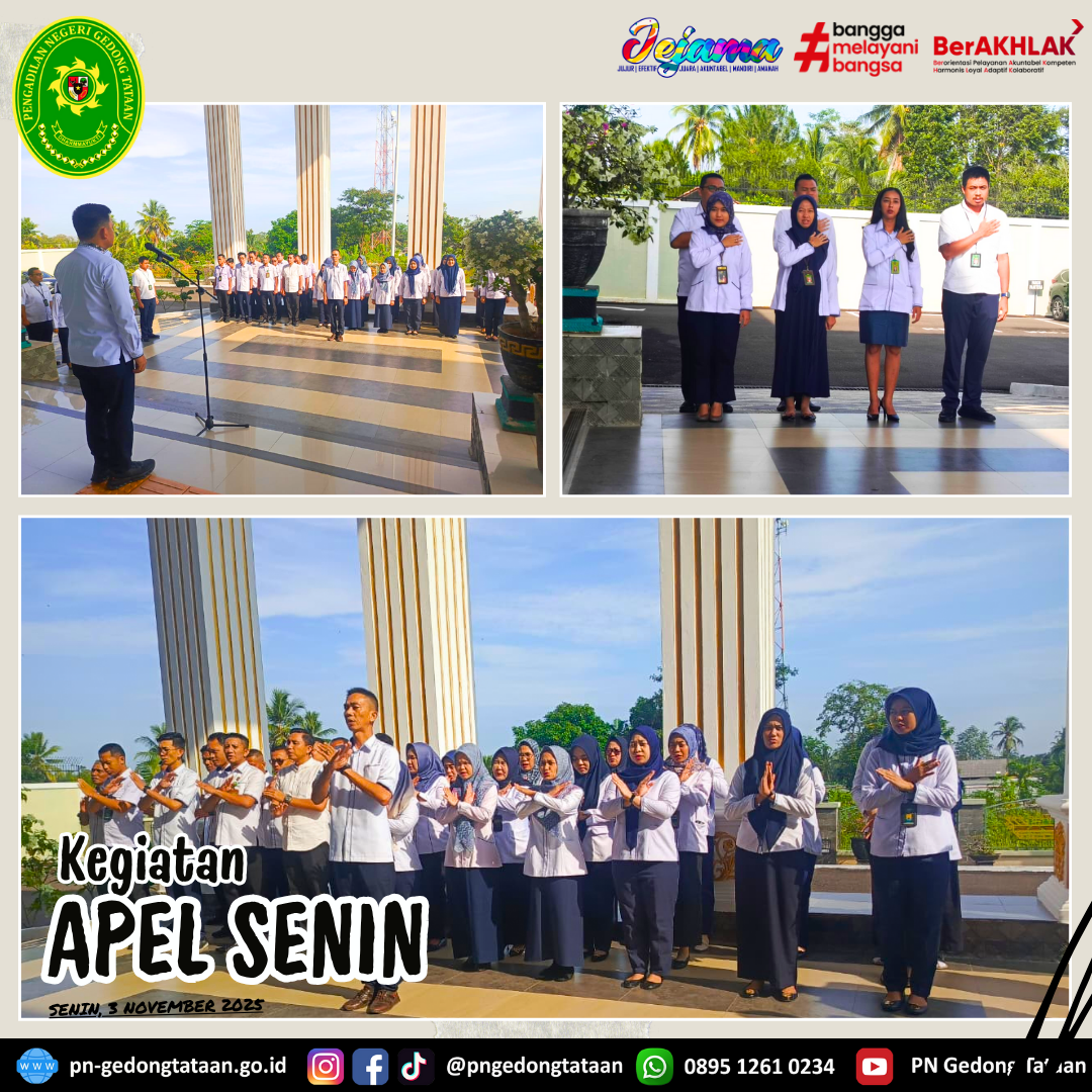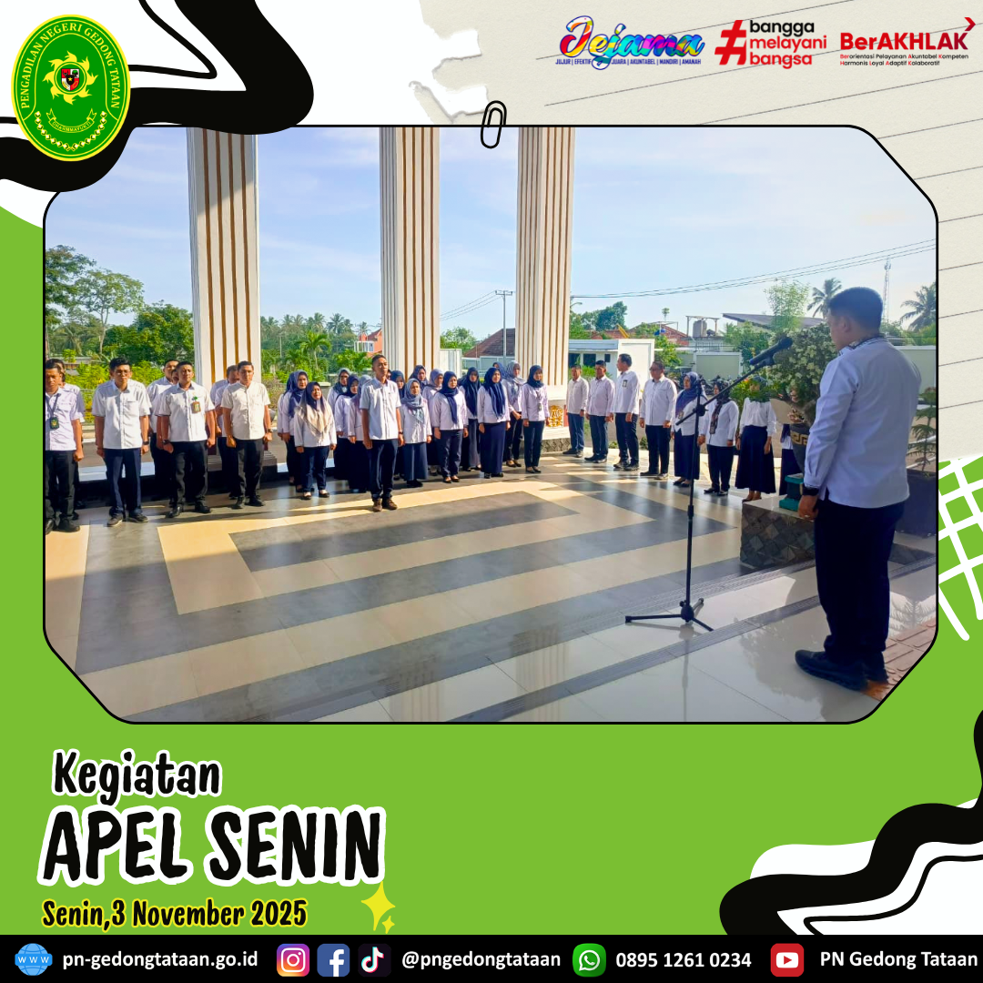 Bertindak sebagai Pembina apel yaitu Ketua Pengadilan Negeri Gedong Tataan Bapak Nugraha Medica Prakasa, S.H., M.H. dan Bapak Faisal Rakhman bertindak sebagai Pemimpin apel.