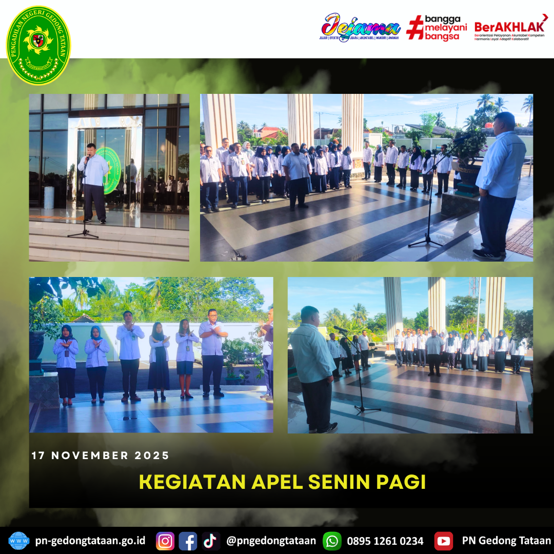 Bertindak sebagai Pembina apel yaitu Wakil Ketua Pengadilan Negeri Gedong Tataan Bapak Dr. Edy Siong, S.H., M.H. dan Bapak Erwanda Hadinata, S.H. bertindak sebagai Pemimpin apel.