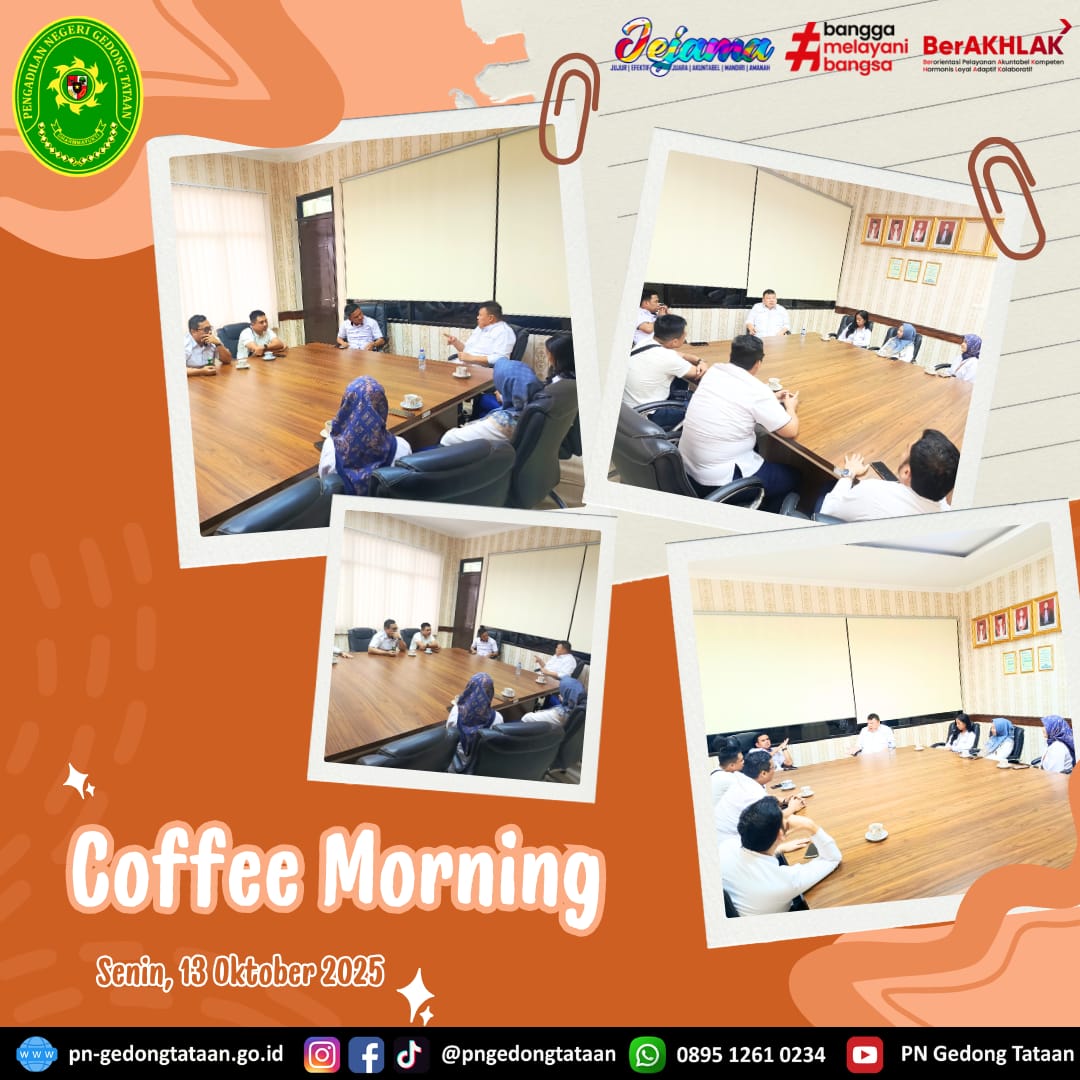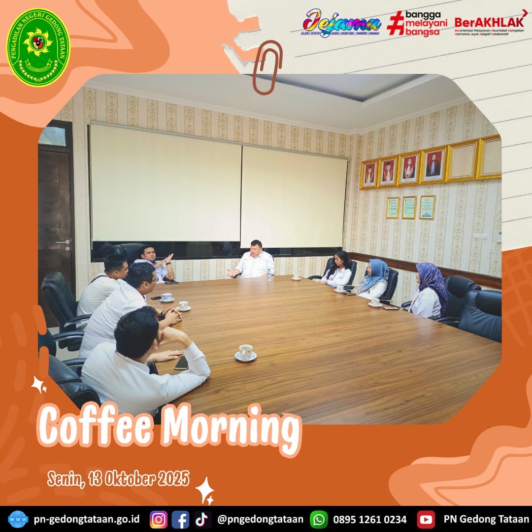 Ketua Pengadilan Negeri Gedong Tataan Bapak Nugraha Medica Prakasa, S.H., M.H., Wakil Ketua Pengadilan Negeri Gedong Tataan Dr. Edy Siong, S.H., M.Hum. bersama dengan Hakim- Hakim Pengadilan Negeri Gedong Tataan Melaksanakan Kegiatan Coffee Morning di Ruang Rapat Ketua Pengadilan Negeri Gedong Tataan.