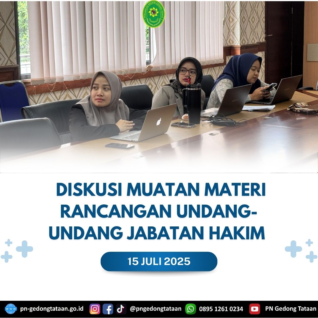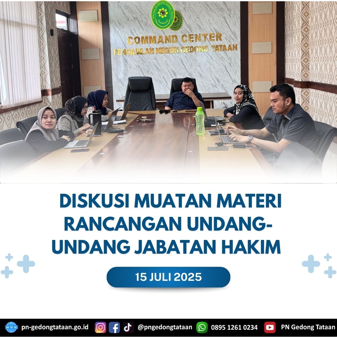 Bertempat di Ruang Command Center Pengadilan Negeri Gedong Tataan, Wakil Ketua Pengadilan Negeri Bapak Dr. Edy Siong, S.H., M.Hum. bersama dengan Para Hakim Pengadilan Negeri Gedong Tataan Mengikuti Diskusi Muatan Materi Rancangan Undang-Undang Jabatan Hakim secara daring.