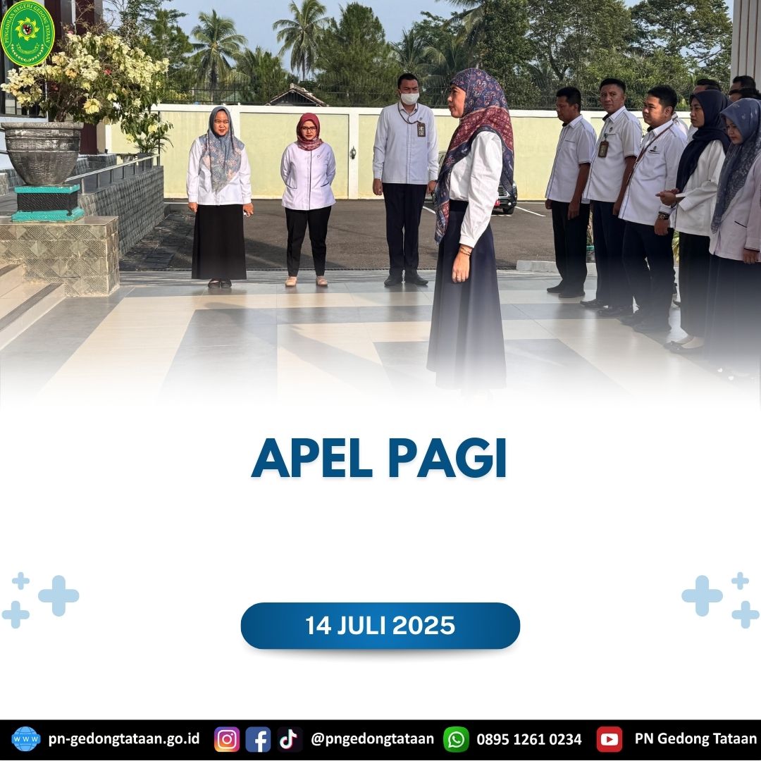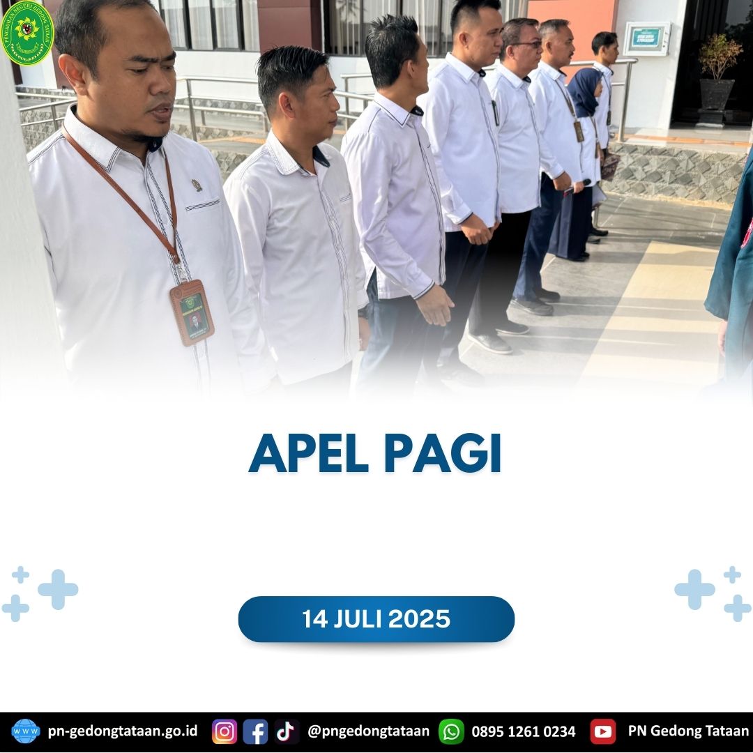Dilaksanakannya kegiatan rutin apel pagi, diikuti oleh seluruh Aparatur Pengadilan Negeri Gedong Tataan. Bertindak sebagai Pembina apel yaitu Ketua Pengadilan Negeri Gedong Tataan Bapak Nugraha Medica Prakasa, S.H.,M.H dan Sdr. Reli Perisnawati, A.Md bertindak sebagai Pemimpin apel.