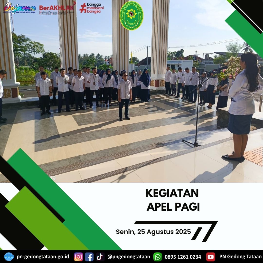 Dilaksanakannya kegiatan rutin apel pagi, diikuti oleh seluruh Aparatur Pengadilan Negeri Gedong Tataan. Bertindak sebagai Pembina apel yaitu Hakim Pengadilan Negeri Gedong Tataan Ibu Vidya Triananda, S.H.,M.H dan Sdr. Achmad Febriyanto, S.H bertindak sebagai Pemimpin apel.