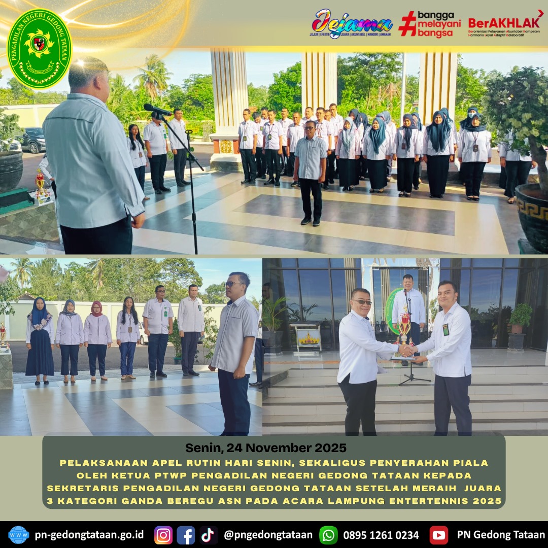 Telah dilaksanakannya apel pagi hari senin di lapangan lobby PN Gedong Tataan, yg diikuti oleh seluruh Pegawai PN Gedong Tataan dan bertindak sebagai Pembina Apel YM Bapak. Dr. Edy Siong, S. H., M.Hum serta Bapak Ahmad Febrianto, S.H sebagai pemimpin apel.