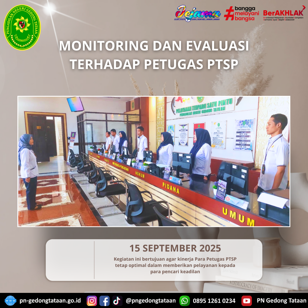 Setelah dilaksanakannya apel pagi, dilanjutkan dengan kegiatan monitoring dan evaluasi terhadap Petugas PTSP oleh Hakim Pengadilan Negeri Gedong Tataan Ibu Nazarida Anastassia Haniva, S.H,.