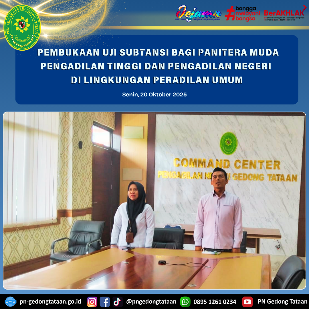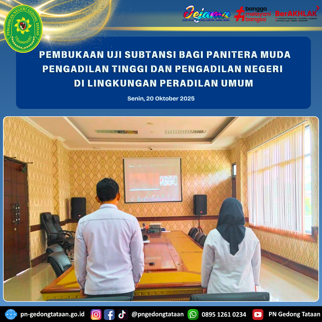 Panitera Muda Perdata Ibu Wirda Ningsih, S.Pd., S.H., M.H. dan Panitera Muda Pidana Bapak Rahmat Yannuar, S.T., S.H., M.H. Mengikuti Kegiatan Pembukaan Uji Subtansi bagi Panitera Muda Pengadilan Tinggi dan Pengadilan Negeri di Lingkungan Peradilan Umum secara daring di Ruang Command Center Pengadilan Negeri Gedong Tataan.