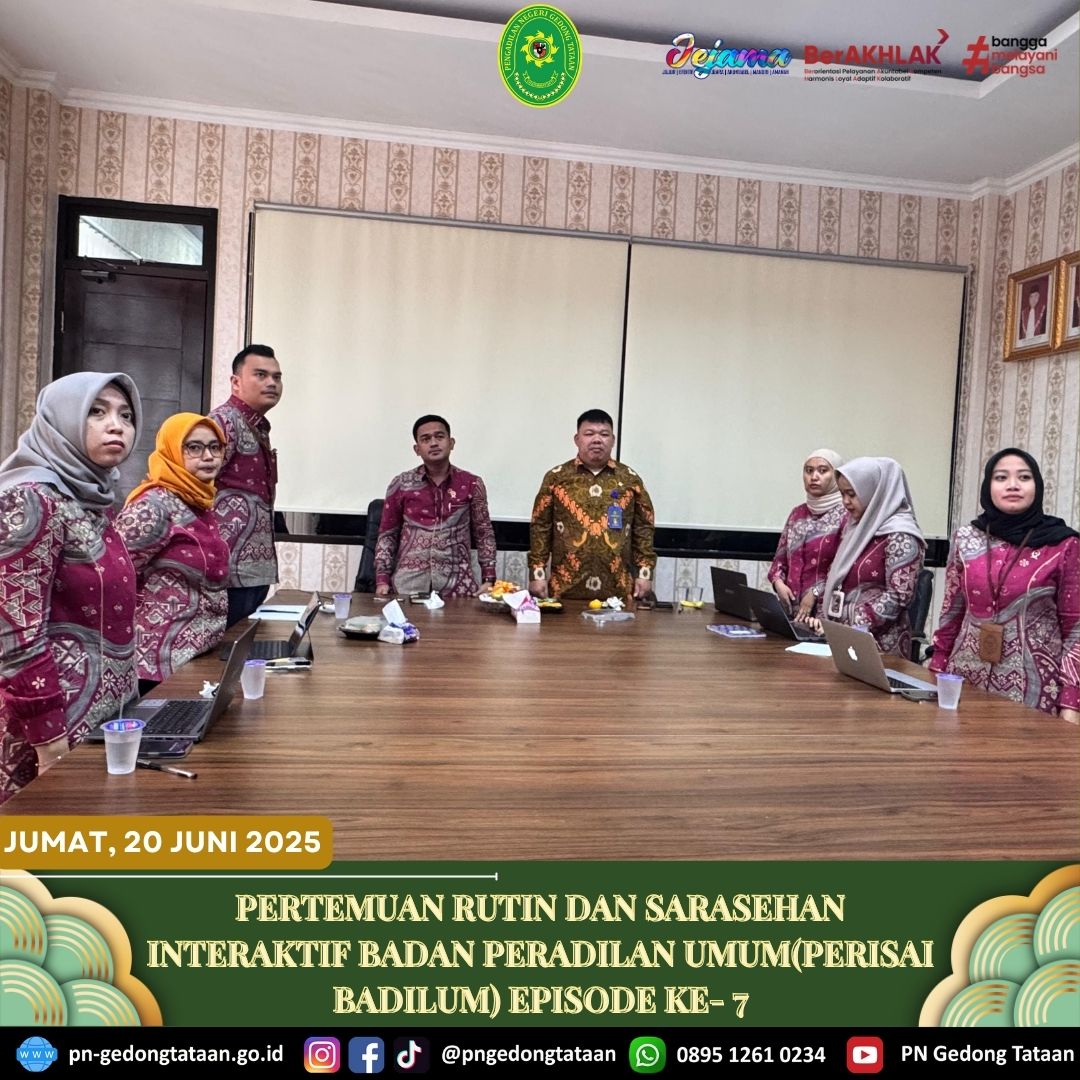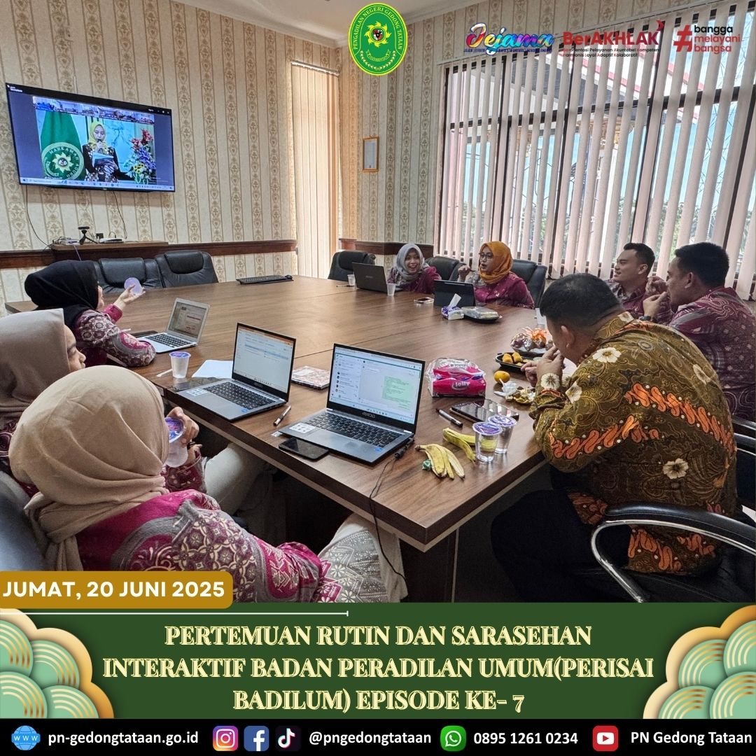 Ketua Pengadilan Negeri Gedong Tataan Bapak Nugraha Medica Prakasa, S.H.,M.H, Wakil Ketua Pengadilan Negeri Gedong Tataan Bapak Dr. Edy Siong, S.H.,M.Hum bersama Para Hakim Pengadilan Negeri Gedong Tataan Mengikuti Pertemuan Rutin dan Sarasehan Interaktif Badan Peradilan Umum (Perisai Badilum) Episode ke-7 di Ruang Rapat Ketua Pengadilan Negeri Gedong Tataan.