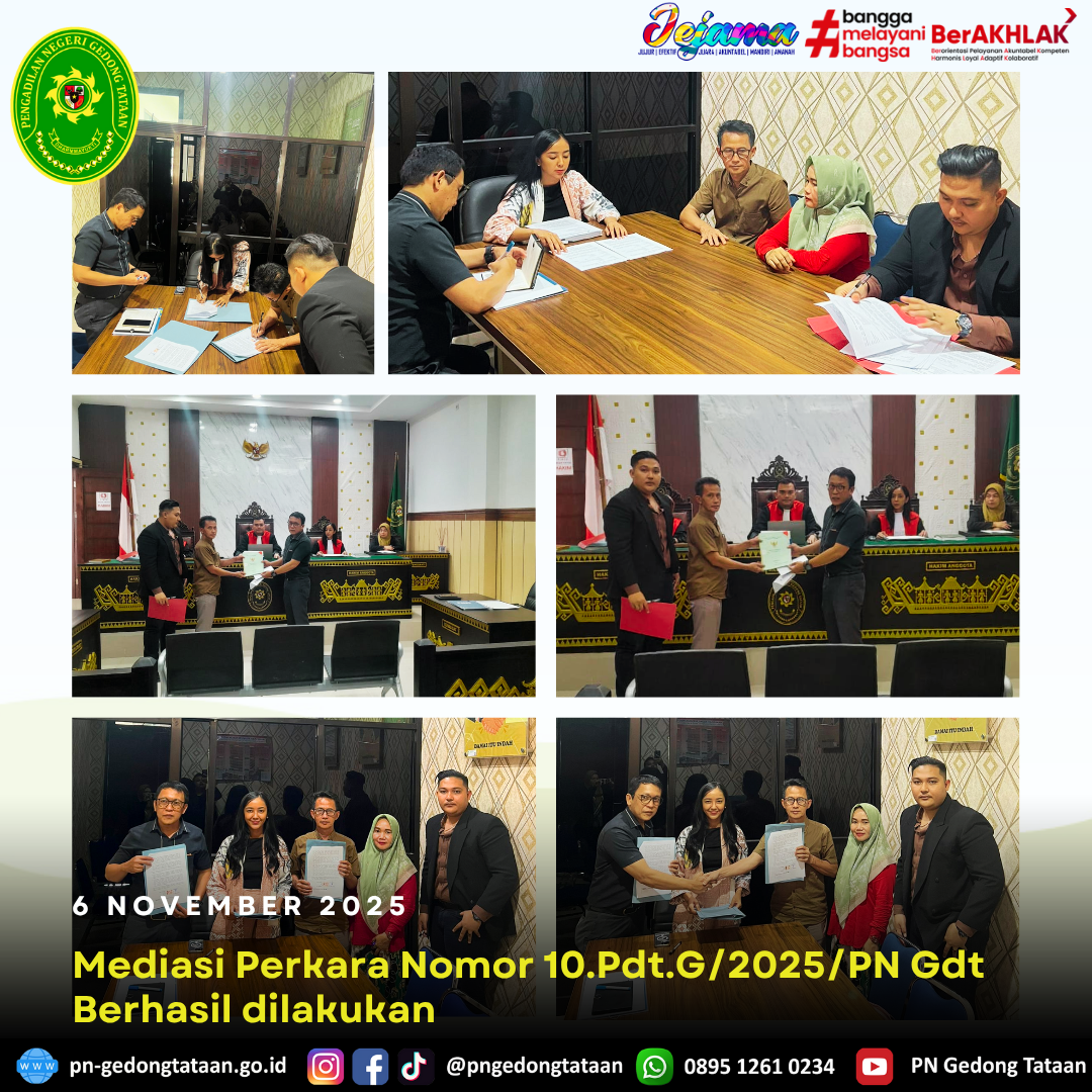 Di Ruang Mediasi Pengadilan Negeri Gedong Tataan telah dilakukan mediasi dengan Nomor Perkara 10.Pdt.G/2025/PN Gdt. Proses mediasi berhasil dilakukan dengan perdamaian yang dipandu oleh Mediator Hakim Ibu Vidya Triananda, S.H., M.H.