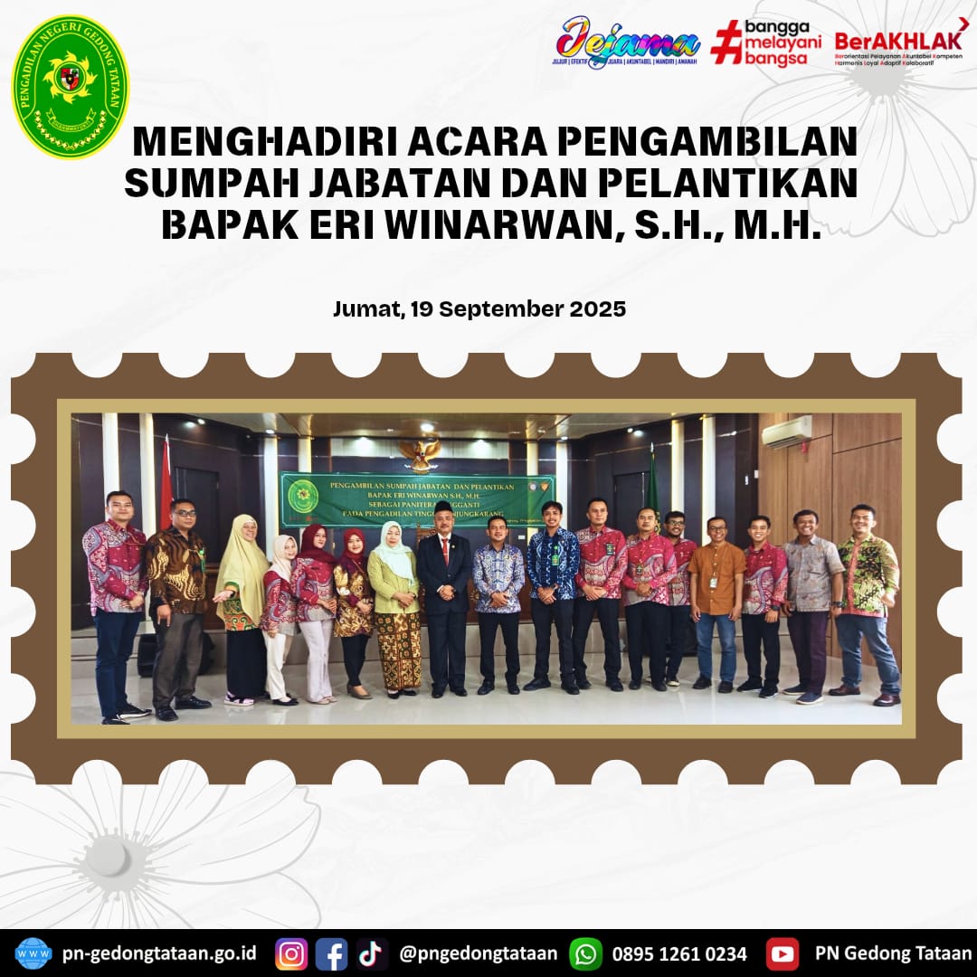 Ketua Pengadilan Negeri Gedong Tataan Bapak Nugraha Medica Prakasa, S.H., M.H. bersama dengan segenap Keluarga Pengadilan Negeri Gedong Tataan Menghadiri Acara Pengambilan Sumpah Jabatan dan Pelantikan Bapak Eri Winarwan, S.H., M.H., sebagai Panitera Pengganti pada Pengadilan Tinggi Tanjungkarang.