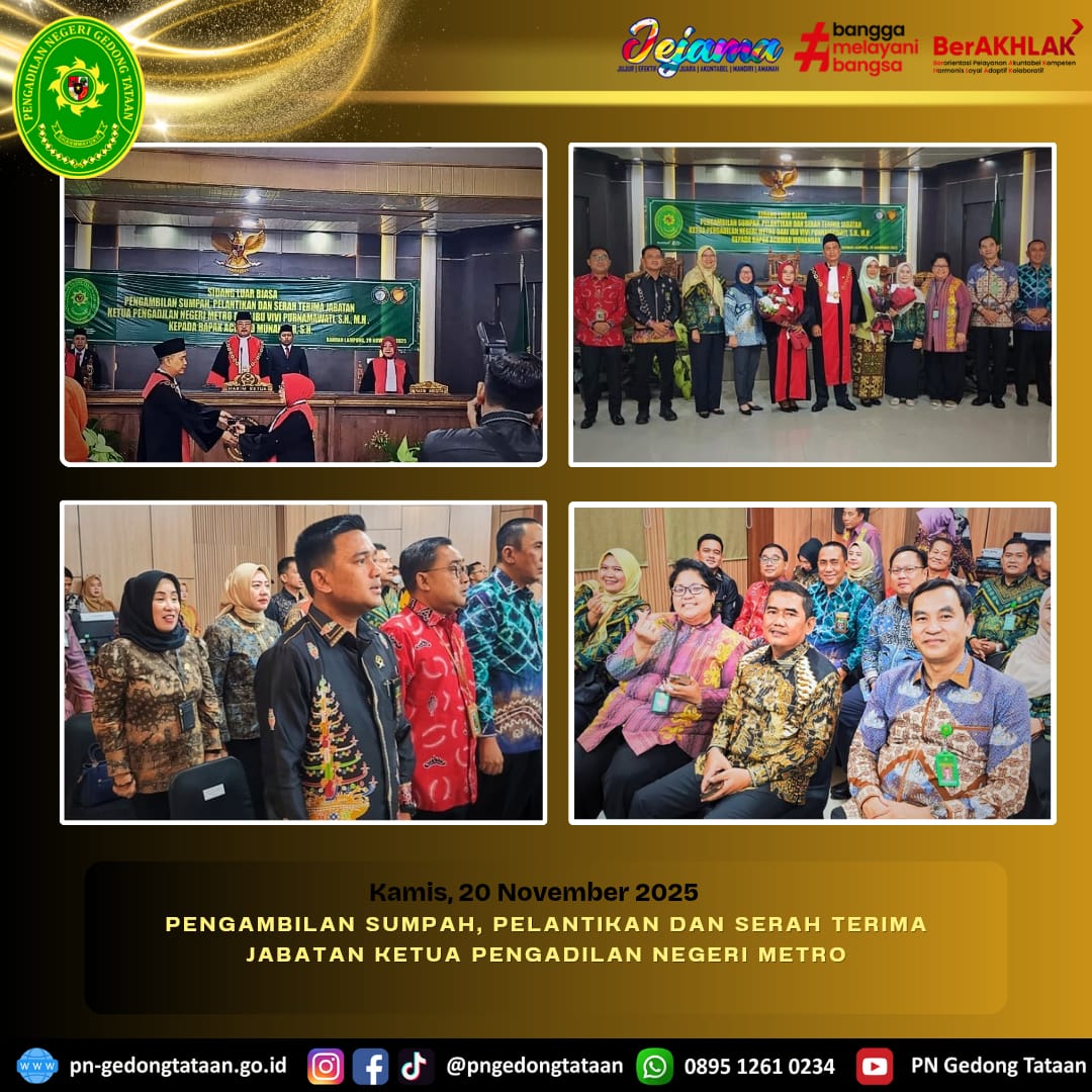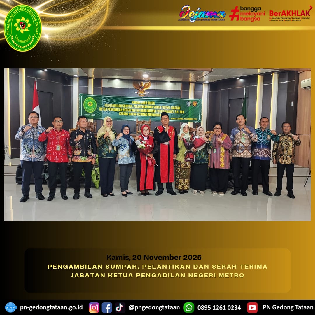 Ketua Pengadilan Negeri Gedong Tataan Bapak Nugraha Medica Prakasa, S.H. M.H. Menghadiri Sidang Luar Biasa Pengambilan Sumpah, Pelantikan dan Serah Terima Jabatan Ketua Pengadilan Negeri Metro dari Ibu Vivi Purnamawati, S.H., M.H., kepada Bapak Achmad Munandar, S.H.