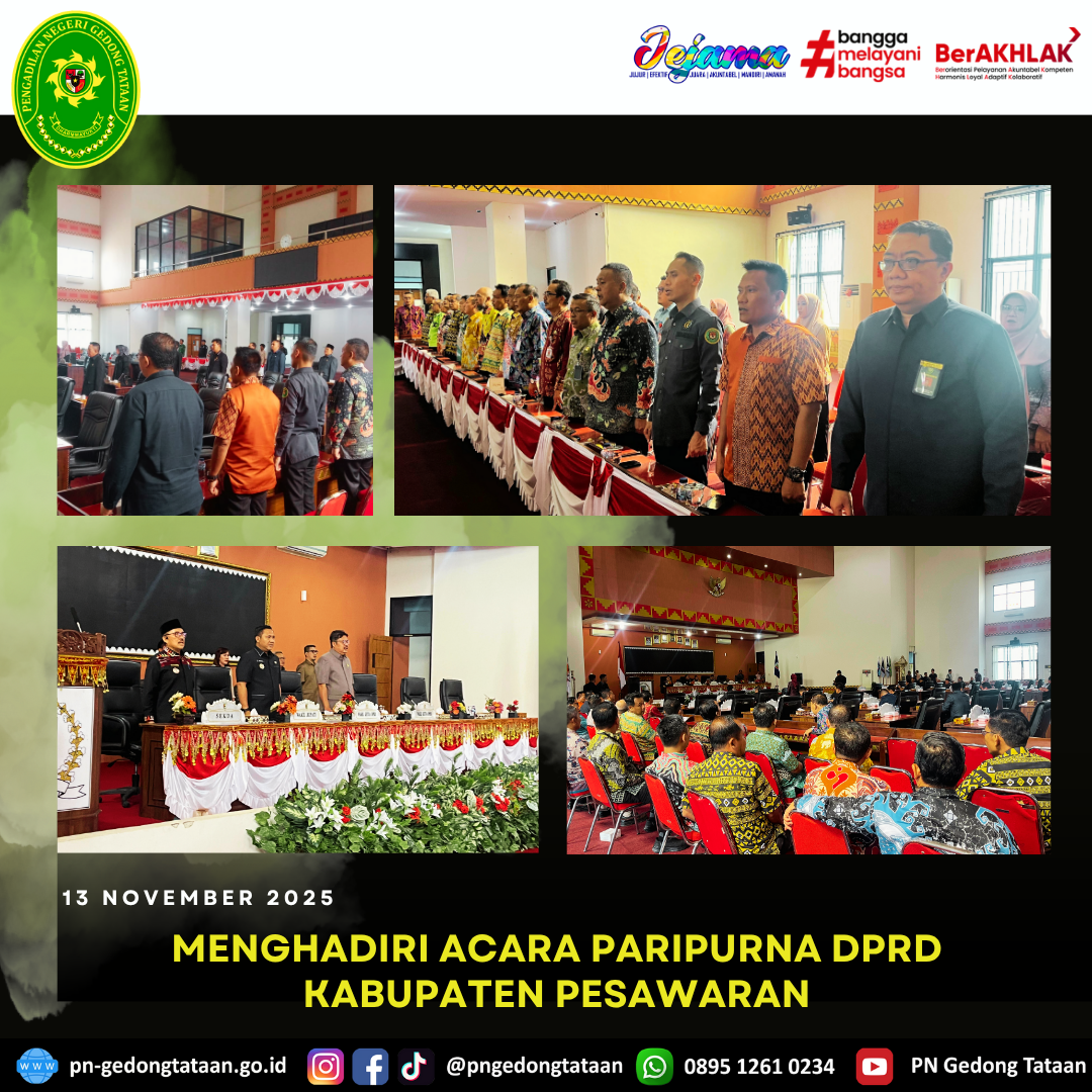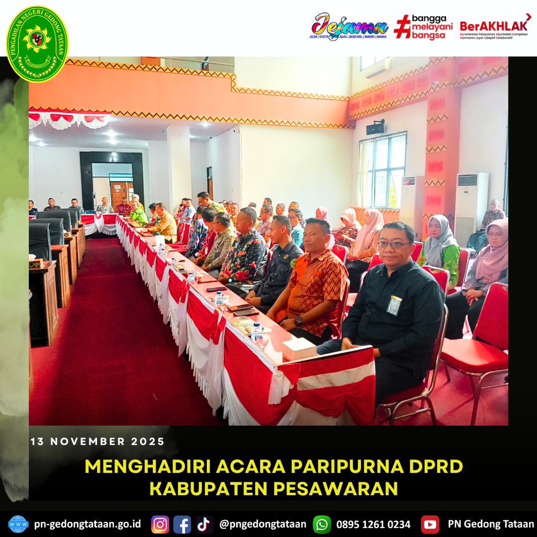 Kamis, 13 November 2025. Ketua Pengadilan Negeri Gedong Tataan yang diwakili oleh Sekretaris Pengadilan Negeri Gedong Tataan Bapak Arya Dharma Syahrie, S.H., M.H. Menghadiri Undangan Acara Paripurna DPRD Kabupaten Pesawaran.