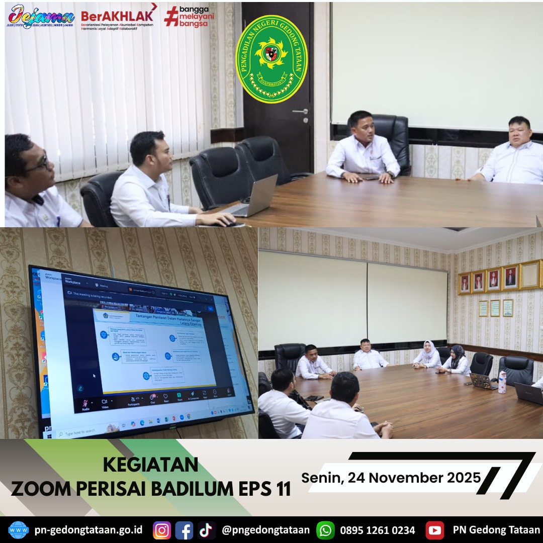 Ketua PN Gedong Tataan beserta Wakil Ketua PN Gedong Tataan bersama para Hakim dan Panitera beserta Panmud Perdata dan staf, mengikuti Zoom Perisai Badilum Episode 11 dengan tema "Eksekusi Lelang, Permasalahan dan solusi". Acara tersebut digelar pada Ruang Rapat Ketua PN Gedong Tataan.