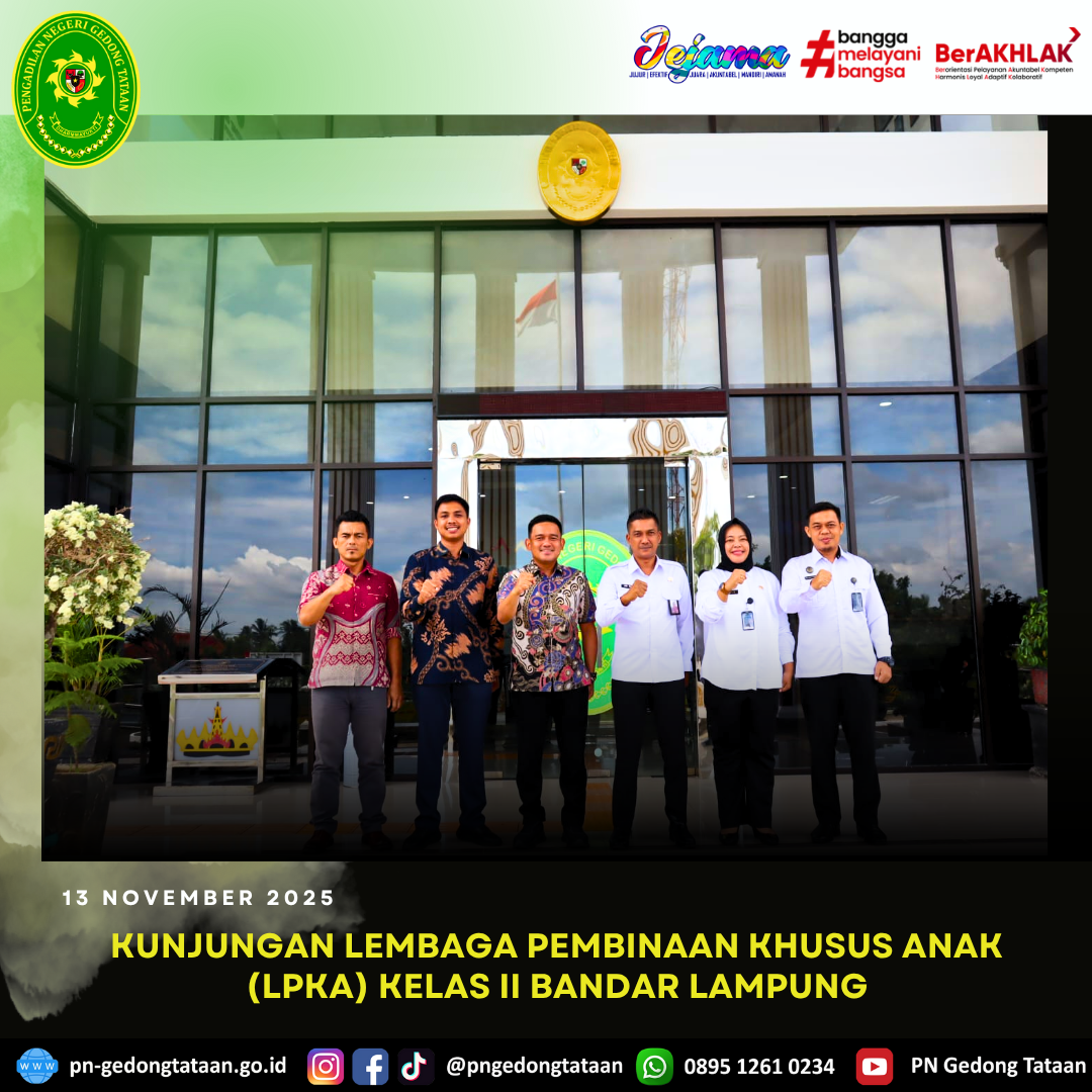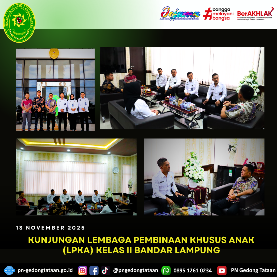 Ketua Pengadilan Negeri Gedong Tataan Bapak Nugraha Medica Prakasa, S.H., M.H. bersama Hakim Pengadilan Negeri Gedong Tataan Bapak Fuady Primaharsa, S.H., M.H. dan juga Panitera Muda Pidana Bapak Rahmat Yannuar, S.T., S.H., M.H. Menyambut baik kunjungan Kepala Lembaga Pembinaan Khusus Anak (LPKA) Kelas II Bandar Lampung, Bapak Ari Fabia Mahardani, S.H., M.H. beserta rombongan dari Lembaga Pembinaan Khusus Anak (LPKA) Kelas II Bandar Lampung.