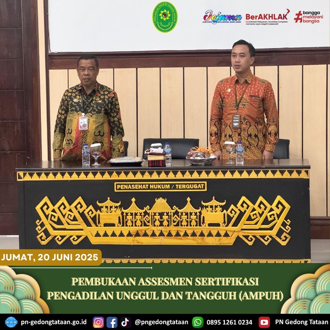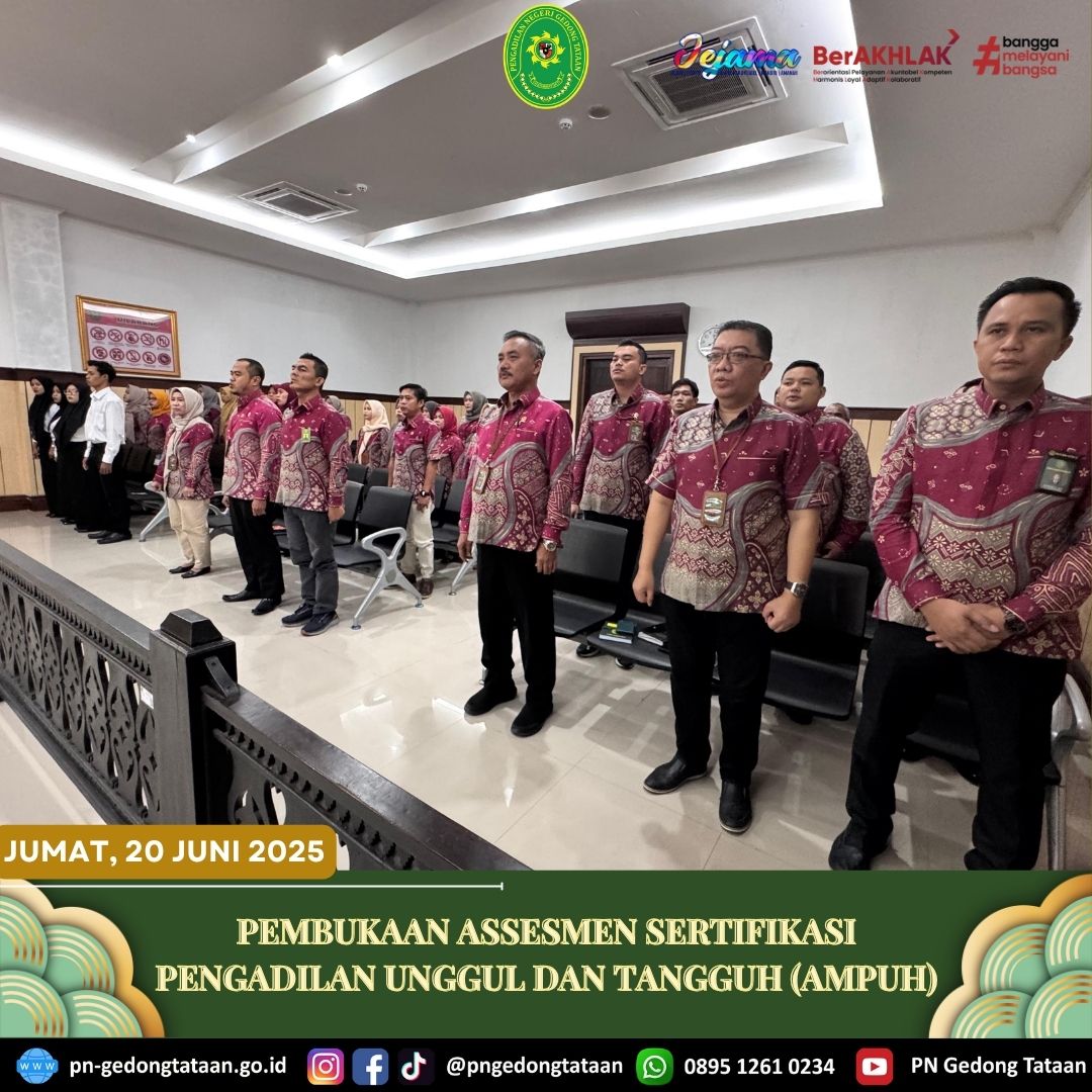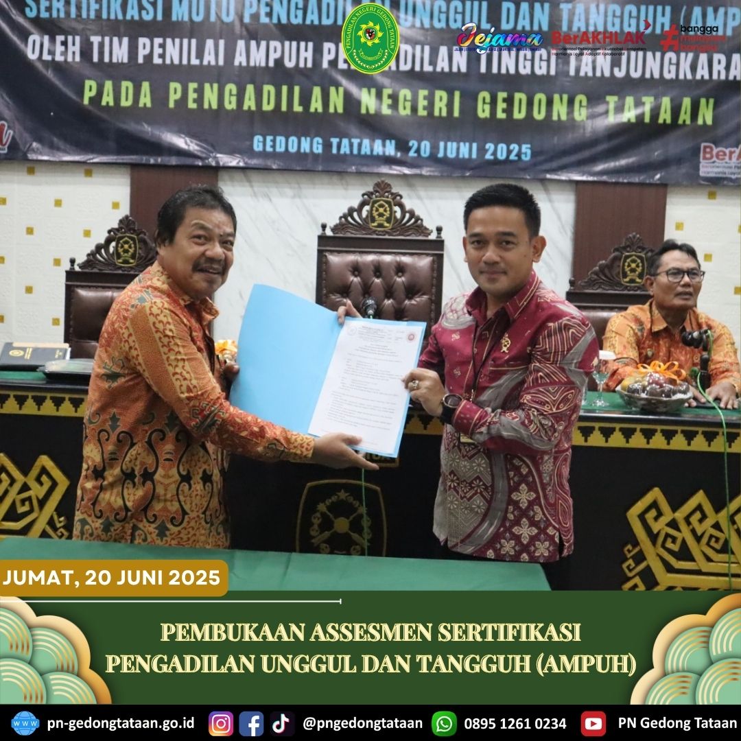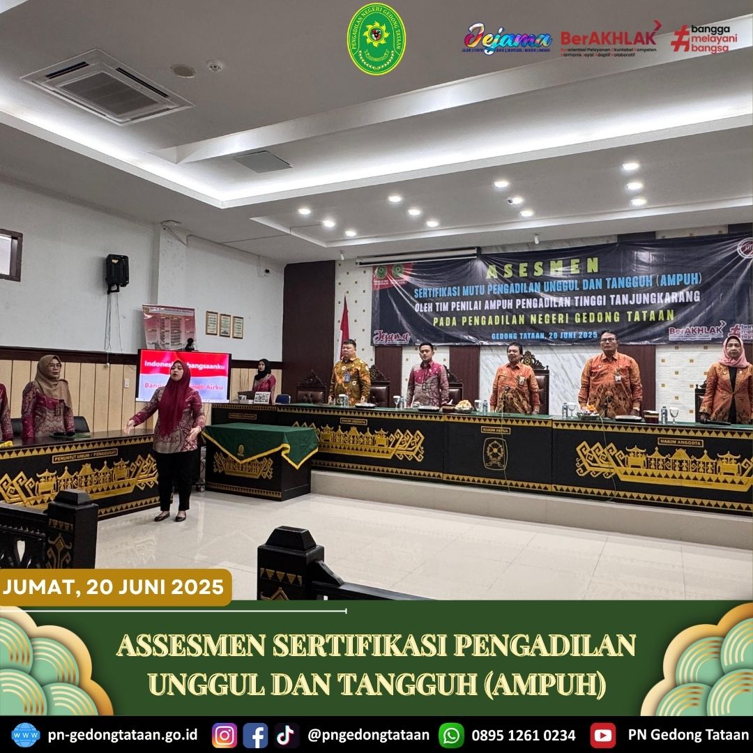Di Ruang Sidang Utama Pengadilan Negeri Gedong Tataan telah terlaksananya Opening Meeting Asesmen Sertifikasi Mutu Pengadilan Unggul dan Tangguh (AMPUH) oleh Tim Asesor Pengadilan Tinggi Tanjungkarang pada Pengadilan Negeri Gedong Tataan sekaligus Pengawasan Daerah dan Pendampingan Pembangunan Zona Integritas pada Pengadilan Negeri Gedong Tataan oleh Hakim Tinggi Pengawas Daerah Pengadilan Tinggi Tanjungkarang dengan Tim yaitu sebagai berikut: