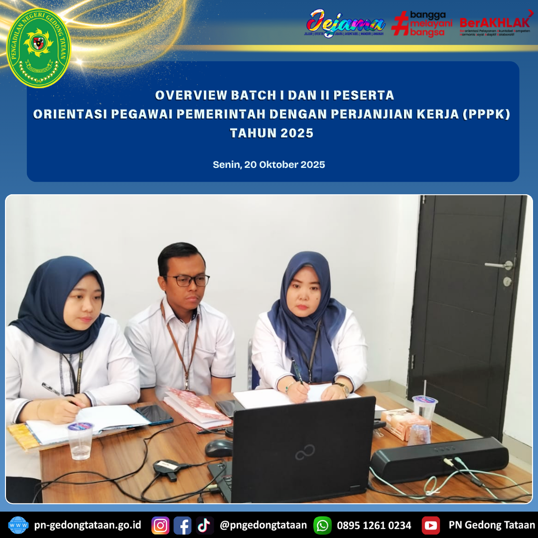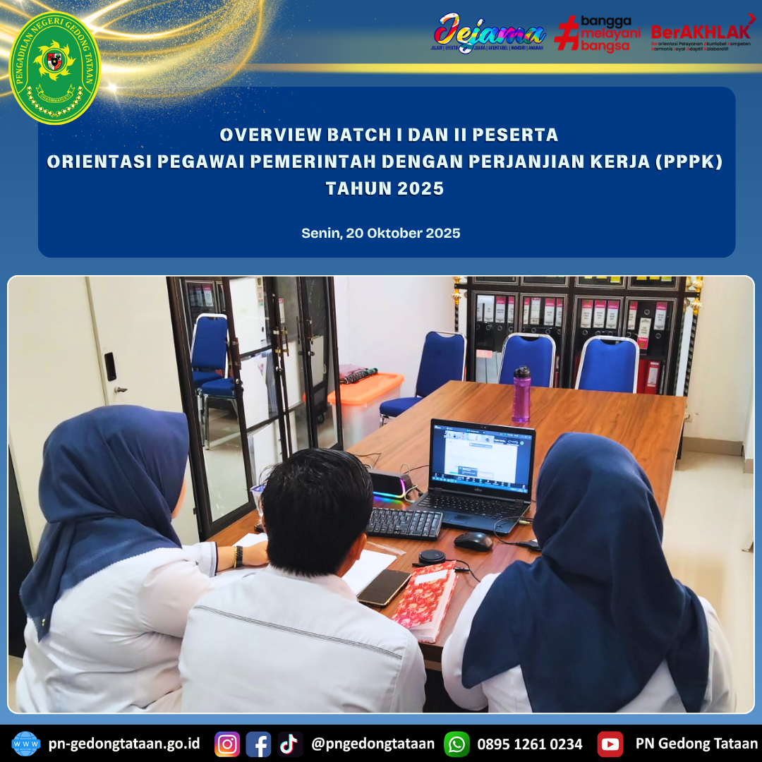 Telah dilaksanakannya Overview Batch I dan II Peserta Orientasi Pegawai Pemerintah dengan Perjanjian Kerja (PPPK) Tahun 2025 secara daring di Ruang APM PN Gedong Tataan yang diikuti oleh Ibu Etika Yuliastuti, S.Pd., Bapak Ahmad Febrianto, S.H., dan Nn. Dita Verica, S.H.