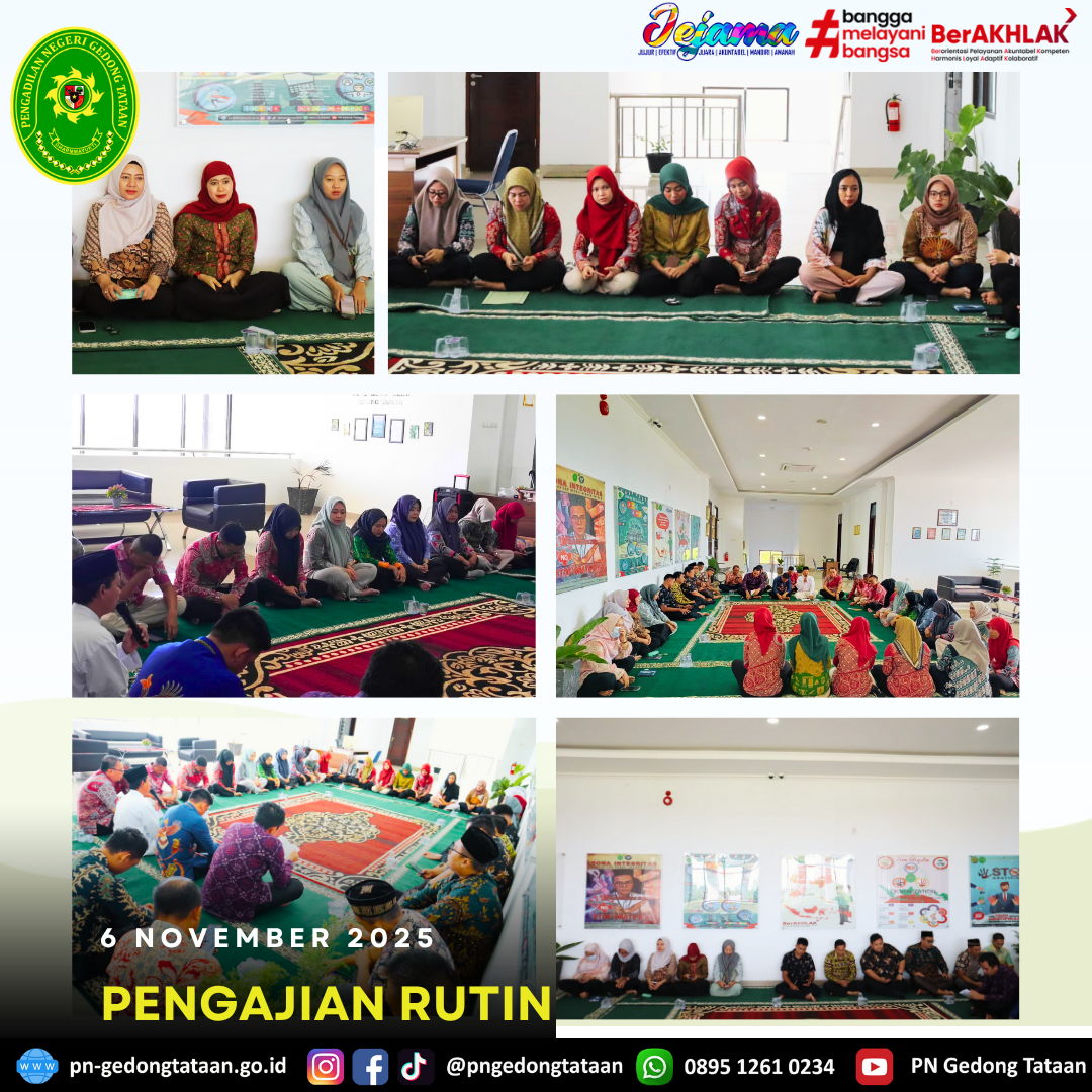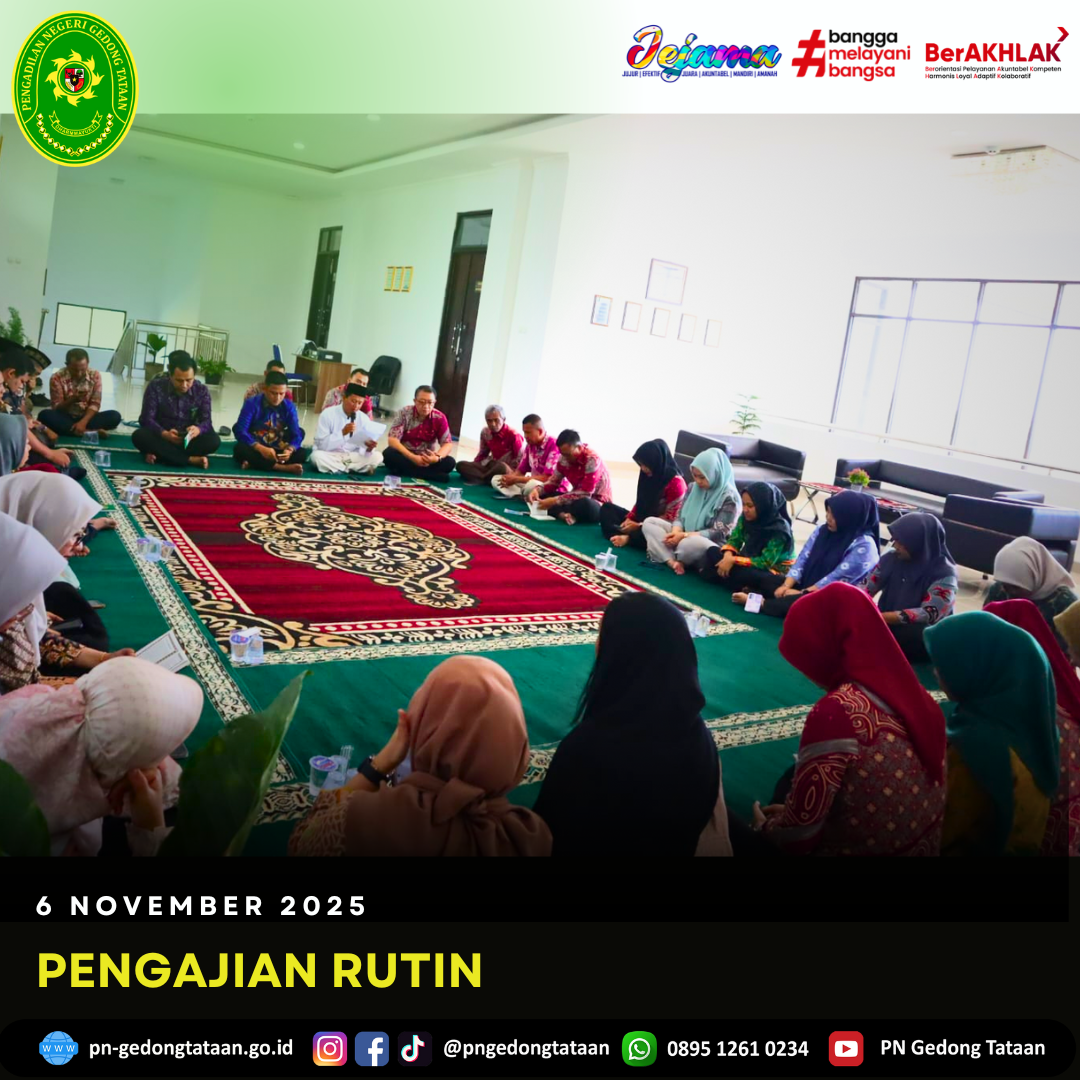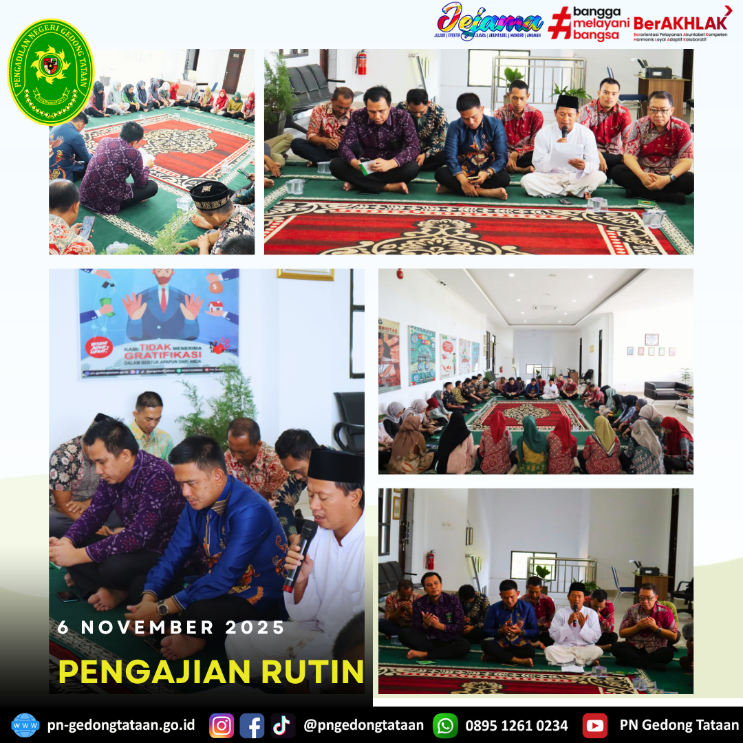 Pengajian rutin ini merupakan kegiatan rutin yang diadakan oleh Pengadilan Negeri Gedong Tataan yang dilaksanakan di Ruang Tamu Terbuka Lantai 2 Pengadilan Negeri Gedong Tataan.