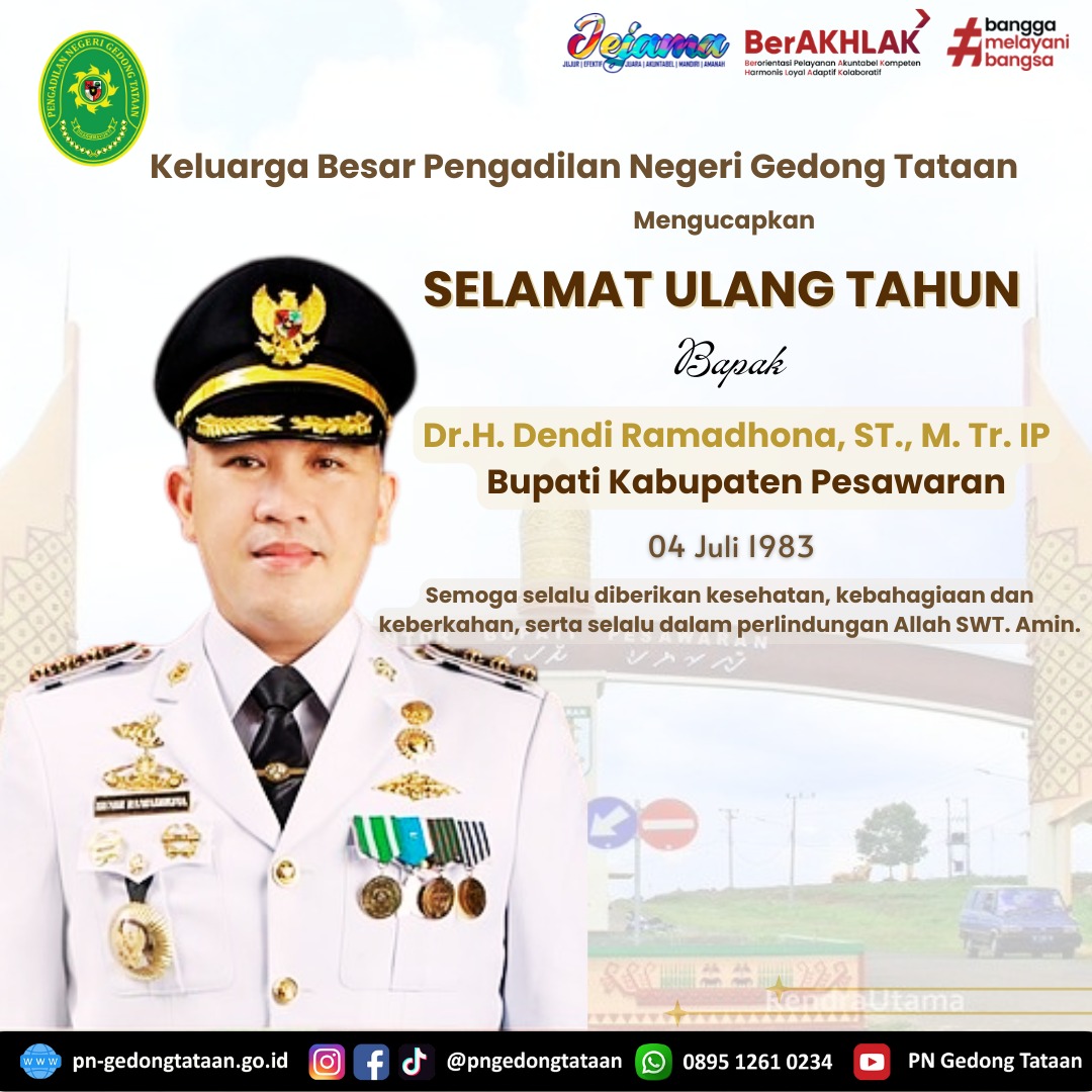 Keluarga Besar Pengadilan Negeri Gedong Tataan Mengucapkan Selamat Ulang Tahun Bapak Dr.H.Dendi Ramadhona, S.T.,M.Tr.I.P selaku Bupati Pesawaran.