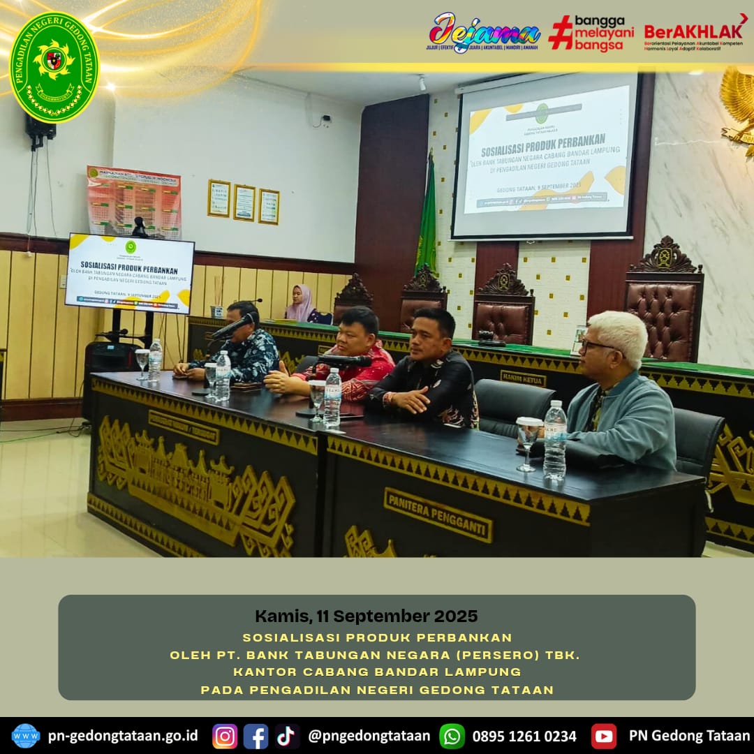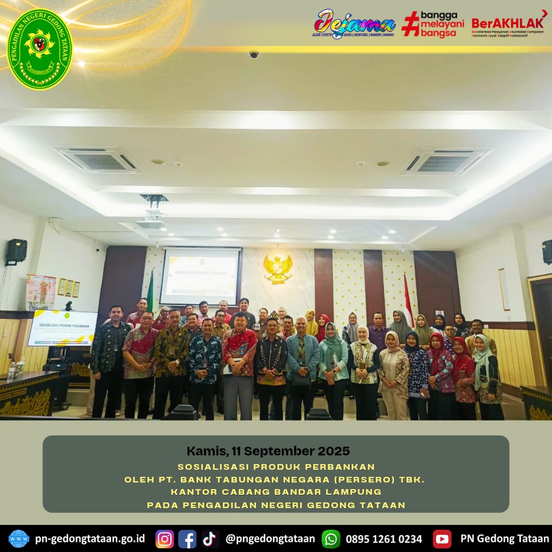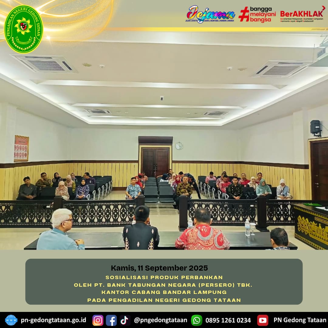 Bertempat di Ruang Sidang Utama Pengadilan Negeri Gedong Tataan, telah dilaksanakannya Sosialisasi Produk Perbankan oleh PT. Bank Tabungan Negara (Persero) Tbk.
