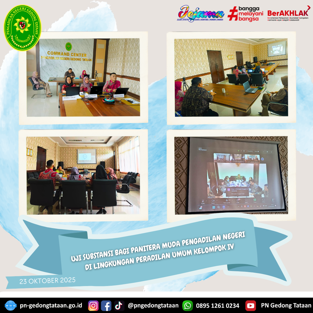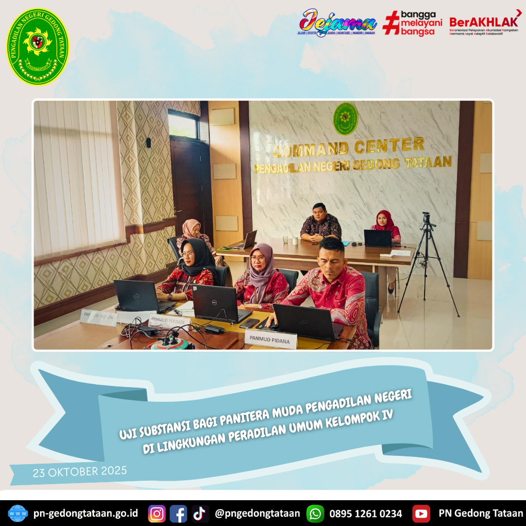 Telah dilaksanakannya Uji Substansi Bagi Panitera Muda Pengadilan Negeri di Lingkungan Peradilan Umum Kelompok IV di Ruang Command Center Pengadilan Negeri Gedong Tataan yang dilaksanakan oleh Ibu Wirda Ningsih, S.Pd., S.H., M.H., selaku Panitera Muda Perdata, Bapak Rahmat Yannuar, S.T., S.H., M.H. selaku Panitera Muda Pidana, dan Ibu Andina Naferda, S.H. selaku Panitera Muda Hukum Pengadilan Negeri Gedong Tataan.