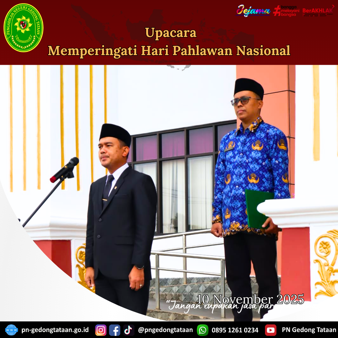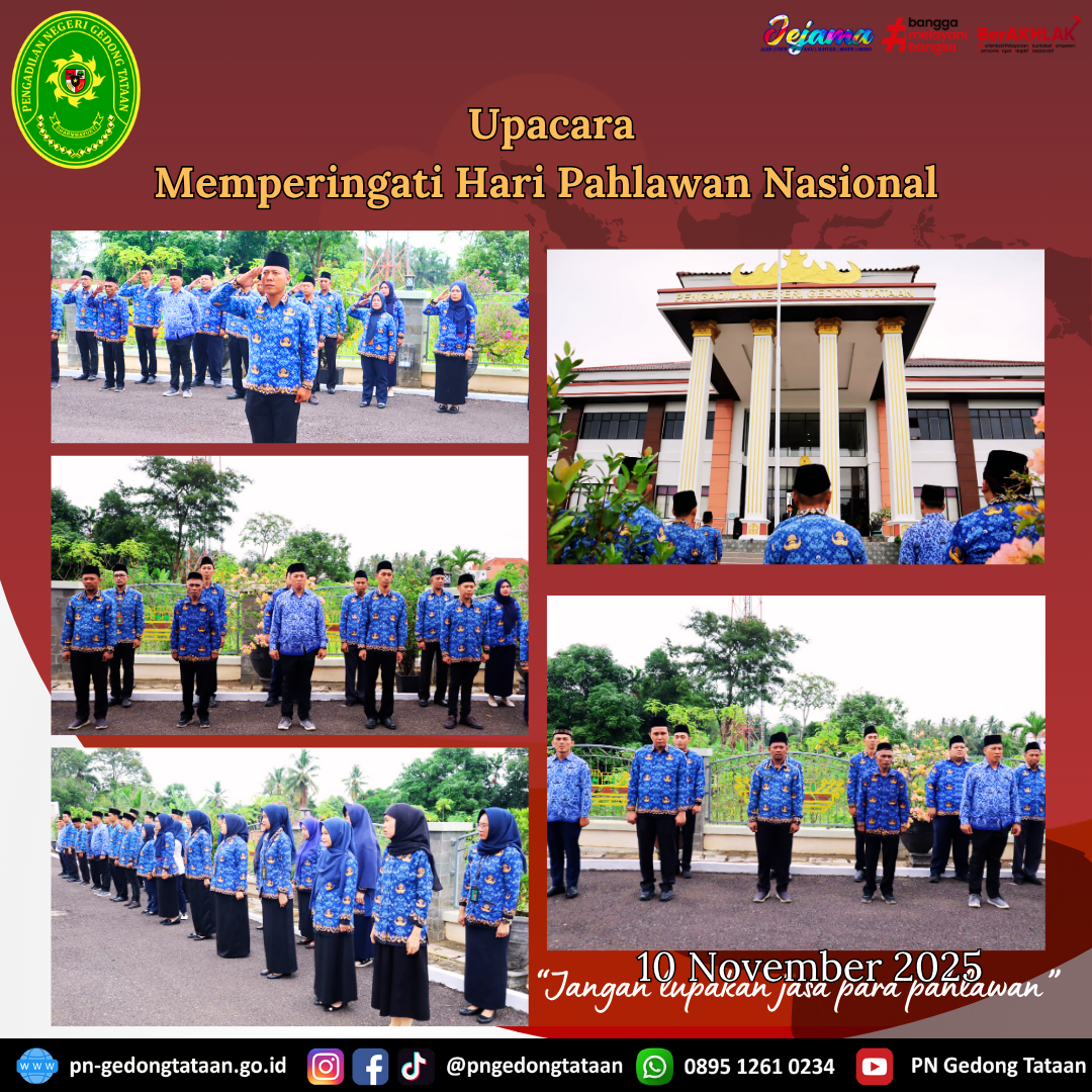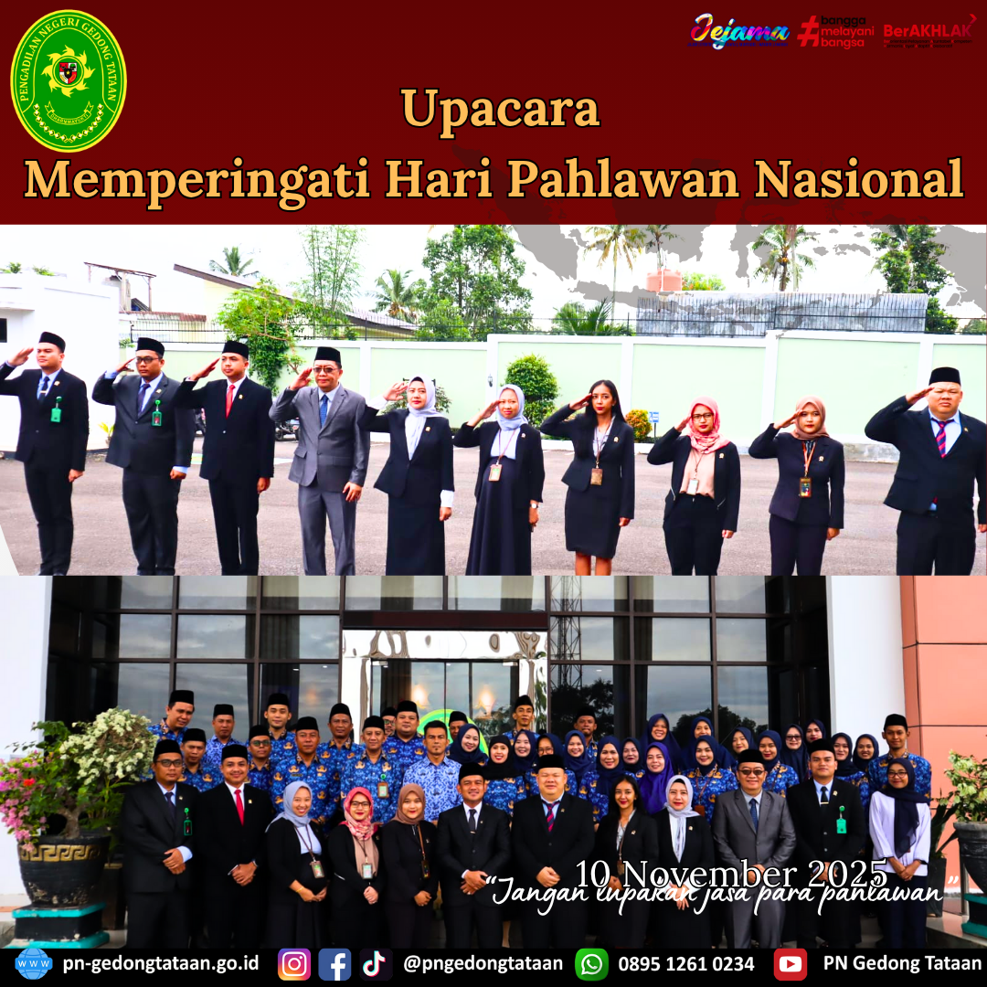Dalam rangka memperingati hari pahlawan nasional, Ketua Pengadilan Negeri Gedong Tataan Bapak Nugraha Medica Prakasa, S.H., M.H. selaku Pembina dan Bapak Hindrik Sirwoko selaku Pemimpin upacara dan diikuti oleh Hakim-Hakim, Panitera, Sekretaris, Pejabat struktural dan fungsional, Staf dan PPPK Pengadilan Negeri Gedong Tataan telah dilaksanakan upacara di Halaman Kantor Pengadilan Negeri Gedong Tataan.